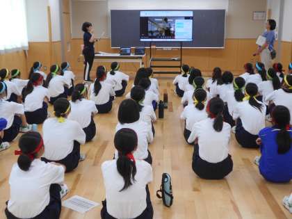 1F多目的室1に男子、2F多目的室2に女子が集まり、両室をオンラインでつなぎ、学年練習を行いました。学年種目の説明を聞き、チーム分けを行いました。