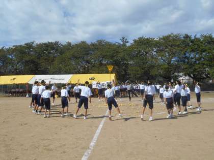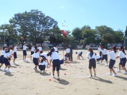 音楽に合わせて踊った後、カゴにめがけて玉を投げ入れました。