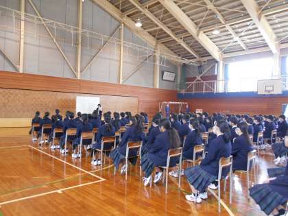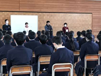 4/7(火) 2学年、第1回学年集会 1 公開日 2020/04/07 更新日 2020/04/07 2学年 整然とした雰囲気の中、2学年の初めての学年集会がありました。 柞野先生…「挑戦(チャレンジ)→チェンジ!」 井上先生…「まず聴く!」(耳+目+心で) →「学(まねぶ)+習(復習)」 藤井先生…「観る!」(気付き→「ありがとう」「ごめんね」)