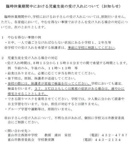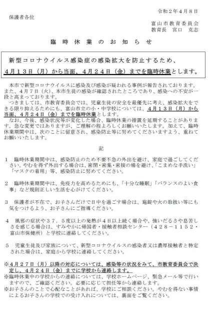富山市教育委員会から、4月13日(月)〜4月24日(金)の臨時休業についての以下の文書が届きました。ご確認ください。「配布文書の一覧」でもご覧いただけます。