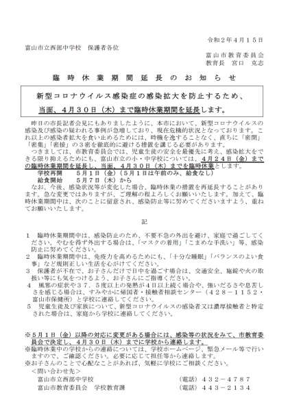 富山市教育委員会より、富山市立の小・中学校について、4月24日(金)までの臨時休業期間を延長し、当面、4月30日(木)までを臨時休業とするお知らせが届きました。文書をご確認ください。