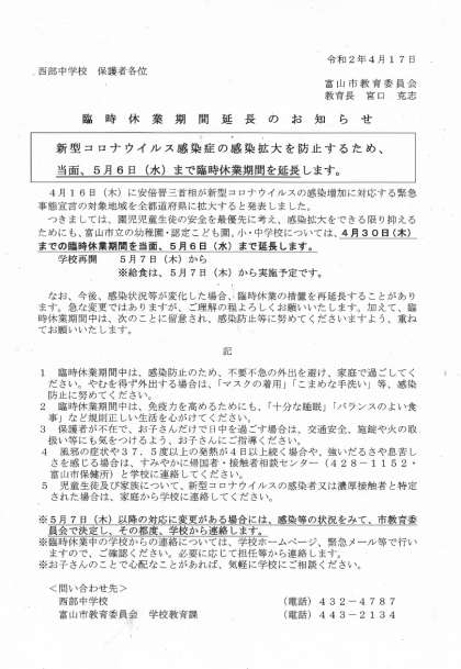 富山市教育委員会より、富山市立の幼稚園・認定こども園、小・中学校については、4月30日(木)までの臨時休業期間を当面、5月6日(水)まで延長するという通知がありました。下の文書をご確認ください。