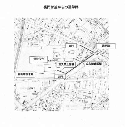 4月から校舎改築工事が始まり、前館前が立ち入り禁止区域となっています。これまで裏門から校地内に入り、登校していた生徒の皆さんは道路を通り、正門より校地内に入ってください。