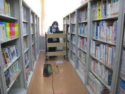 学校司書の先生を始め、たくさんの職員で仮の図書室を整備しています。