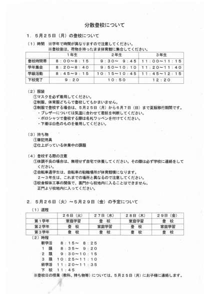 5月25日(月)から始まる分散登校の詳細は、下記の通りです。ご確認ください。3年生は毎日登校、1・2年生は隔日登校となります。25日(月)は、登校時間帯をずらしての全校登校日です。