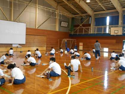 上:1、2組男子 体育「体つくり運動」の授業です。自分でメニューを組み立てて、サーキットトレーニングに取り組みました。