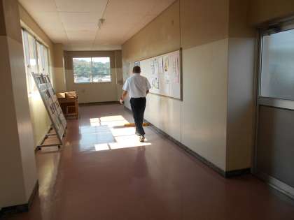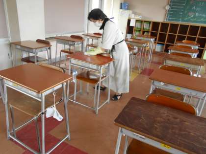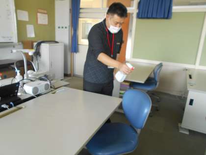3年生の教室、本日も恒例の消毒作業実施中です。