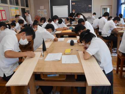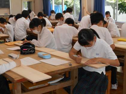 2組の技術「けがきをしよう」の様子です。さしがねを使って木材に線を引いています。正確に線を引こうと、真剣に取り組んでいます。