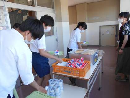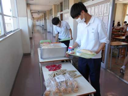 一列に並んで、順にパンや牛乳をお盆の上に載せていきます。要領よく準備ができるようになりました。
