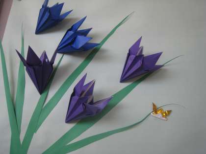 生徒による折り紙作品。桜から紫陽花、アヤメと、季節感あふれる掲示物が完成しました。