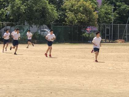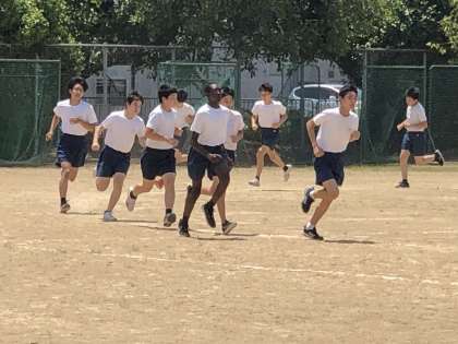 女子に続いて、男子も長距離走のタイムを計測。1500mです。前時の練習を生かし、ペース配分を考えた走りをしていました。