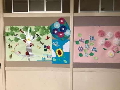 廊下の掲示では、夏を折り紙で表現。朝顔と向日葵が追加。青い空が夏らしさを演出!(下)素敵ですね!