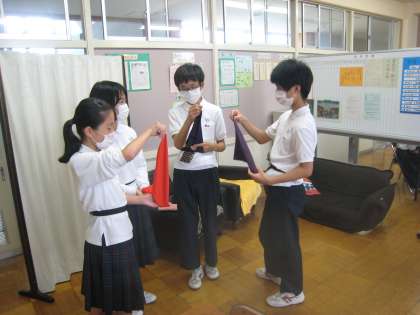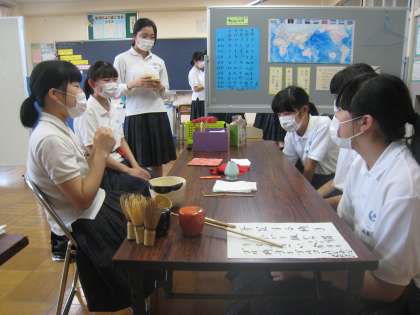 6月30日(火):茶道部 活動の様子 公開日 2020/07/01 更新日 2020/07/01 生徒会・部活動 感染症対策で、お点前の練習をエアで行ったり、自分の茶碗でお茶を点てたりするなど練習方法を工夫しています。 1年生や新入部員は、袱紗(ふくさ)の使い方や茶道具の名前等を先輩から教わっています。