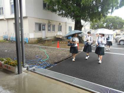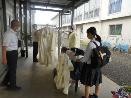 雨の日の朝の登校は、雨具を玄関につり下げることにしました。