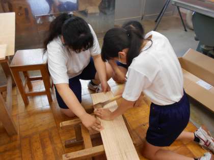2年生の技術科の授業では、本棚を制作しています。2人で協力しながら、のこぎりで木材を切っていました。