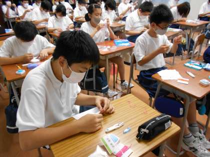 1年生の家庭科の授業では、刺し子をしています。細かい作業に黙々と取り組んでいました。