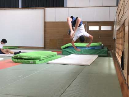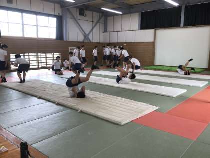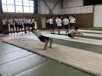 男子は、保健体育の時間にマット運動。難しい技にも果敢に挑戦し、日に日に上達しています。