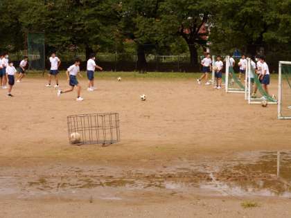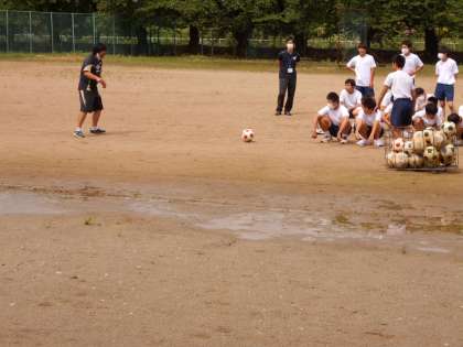 梅雨の合間、太陽の光が降り注ぐ中、グラウンドでサッカーの授業が行われていました。