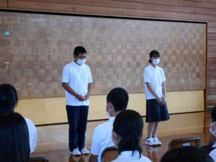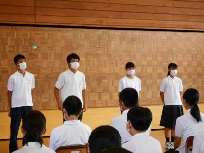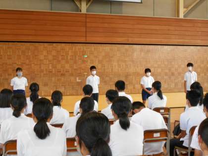 8月31日(月):第2学年 学年集会(その1) 公開日 2020/09/01 更新日 2020/09/01 2学年 体育大会結団式に向けて、学年集会で団リーダーが決意表明をしました。 上:実行委員 中:赤鳳団 下:黄虎団