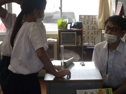理科を担当する教育実習生の初授業がありました。質量と体積の測定方法を実際の器具を見せながら説明しています。
