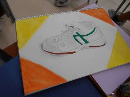 2年の英語の授業では、go 〜ingの表現を振り返りました。1年の美術の授業では、シューズの絵を描いています。作品が完成しました。