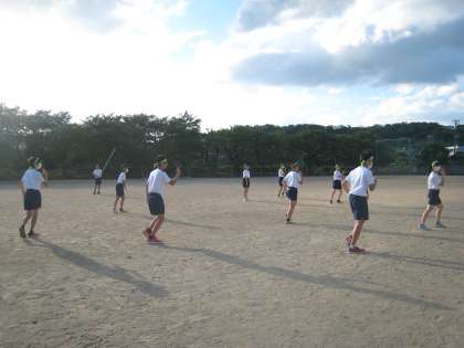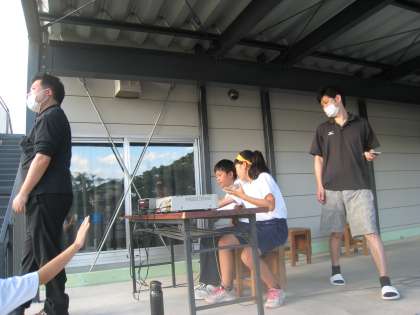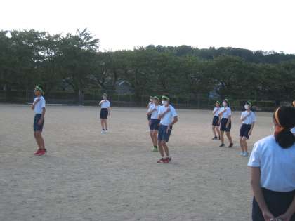 団リーダーによる応援練習。グラウンドで、音楽や放送とも合わせました。