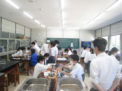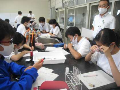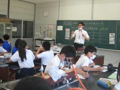 1年2組で理科の研究授業をしました。今日の学習課題は「実験で白い粉末の正体を確かめよう!」