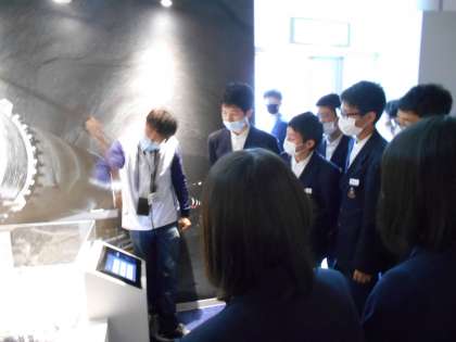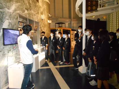スーパーカミオカンデで研究されている素粒子ニュートリノの説明を受けています。