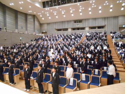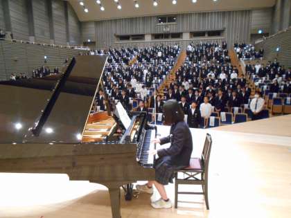 最後に、全校生徒で校歌を斉唱しました。ホールに校歌が響き渡りました。