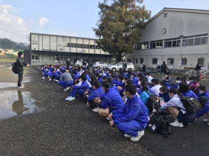 雨が上がり、生徒玄関前で集合しました。いよいよ出発です。