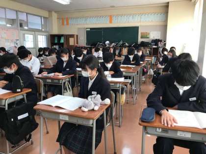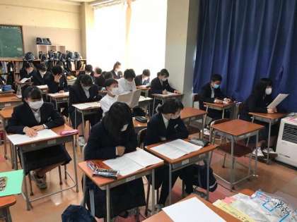 10/30(金) 選挙当日(立ち会い演説会) 2 公開日 2020/10/30 更新日 2020/10/30 生徒会・部活動 コロナの影響で、立ち会い演説は放送で。 放送順番を待つ立候補者と応援弁士(上) 放送を聞く2年3組(中) 〃 2年1組(下)