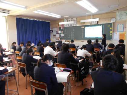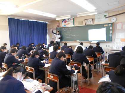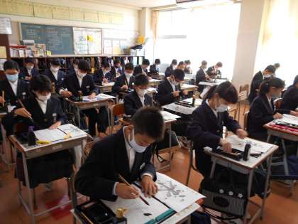 1年の国語の授業では、習字をしました。2年の社会の授業では、瀬戸内工業地域について学習しました。3年の国語の授業では、新古今和歌集について学びました。