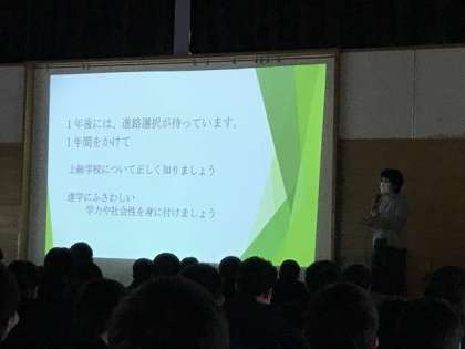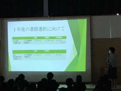 11月4日(水):第2学年 進路集会 公開日 2020/11/04 更新日 2020/11/04 2学年 合唱コンクールや校外学習を終え、大きな行事が一段落しました。次は、各自の進路について、じっくりと考える時期です。 6時間目の総合的な学習の時間に「進路の学習」として、学年集会を行いました。1年後の進路選択に向けて、まずは自分の適性を知ることからスタートです。 ご家庭でも、進路について話し合うきっかけにしてください。
