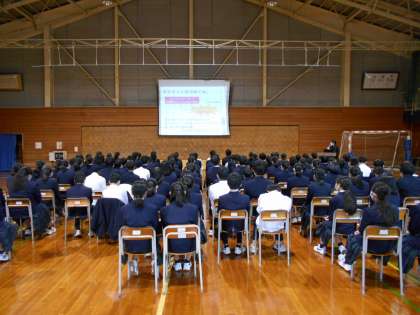 富山大学附属病院の産婦人科医である田中先生をお招きし、2年生を対象に性に関する講演会「一緒に考えよう 〜性と生〜」を実施しました。思春期の心と体の変化や、性に関するトラブル等についてお話を聞きました。
