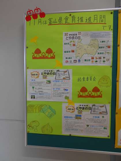 「富山県食育推進月間」に合わせて、給食委員会が作成した掲示物です。今月は、富山産の食材を使った「学校給食とやまの日」の特別献立があります。次回は16日(月)です。