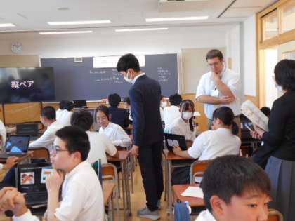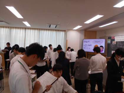 本日午後、県中学校教育課程研究大会富山地区英語部会が本校で行われました。富山市内の英語の先生が多く見守る中、2年3組と3年3組が研究授業に取り組みました。2年3組は「外国の習慣やマナー等、必要な情報についてやり取りを行う」という学習に取り組みました。