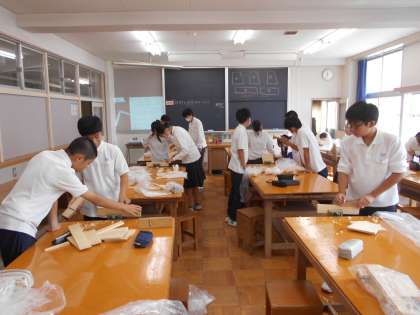 3組技術科では木製品を製作しており、のこぎりびきやかんなけずりといった作業に取り組んでいました。