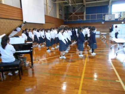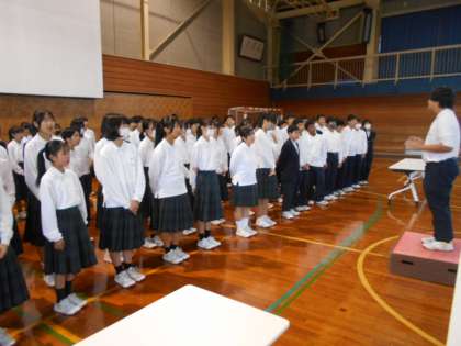 合唱コンクールが11/1(金)に実施されます。当日は県民会館で行いますが、今日は体育館で学年合唱の際のステージ上での並び方等を確認しました。また、学年合唱曲「怪獣のバラード」も歌いました。