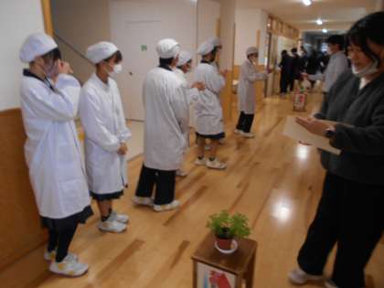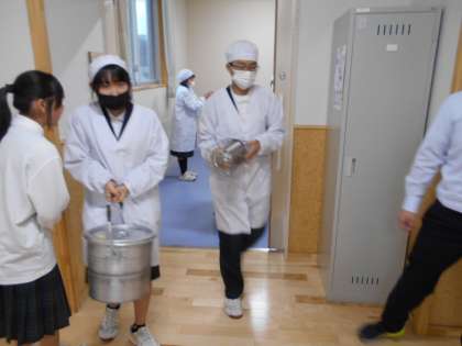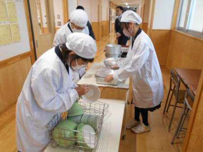 1年生の給食の時間を見に行ってみました。写真は全校一準備が速いと言われる2組の準備の様子です。
