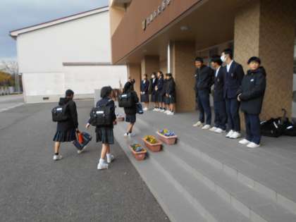 生徒会の挨拶運動「ハローリンクアクション」が毎朝行われています。寒くなる冬場は生徒玄関内で行いますが、昨日今日と朝のお天気がよく、生徒玄関先で行われました。