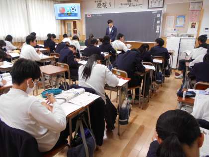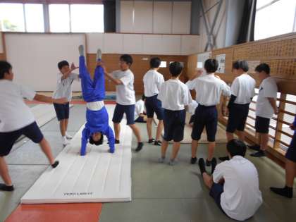 3組保健体育はマット運動。グループをつくって、倒立前転の練習を行いました。正しいやり方のポイントを確認しながら、繰り返し練習していました。