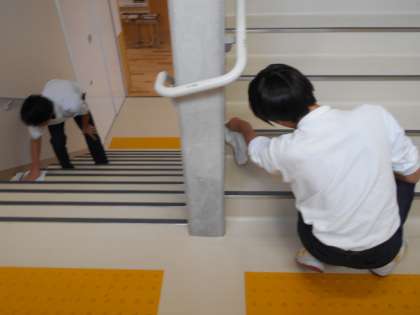 写真は中央階段2〜3F部分を1年生がぞうきんがけしてくれている様子です。