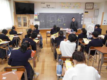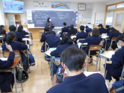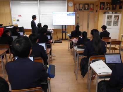 1組音楽は日本の「民謡」について調べ、まとめたレポートの発表会でした。発表者は作成したプレゼンを使って説明し、聴いている人は発表の感想をタブレット端末に入力していました。