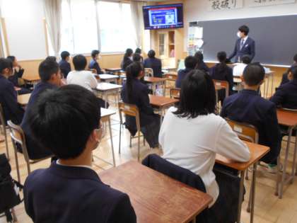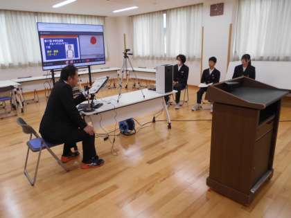 今日は気温や感染症の流行等を考慮し、受賞報告や意見発表、終業式はリモートで実施しました。受賞報告は事前に撮影した画像で紹介しました。