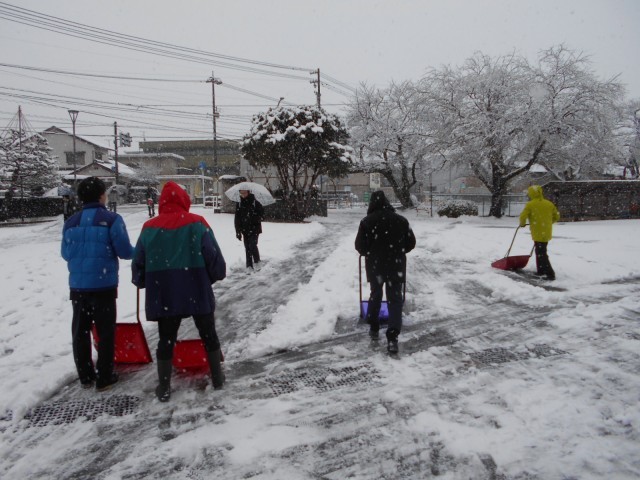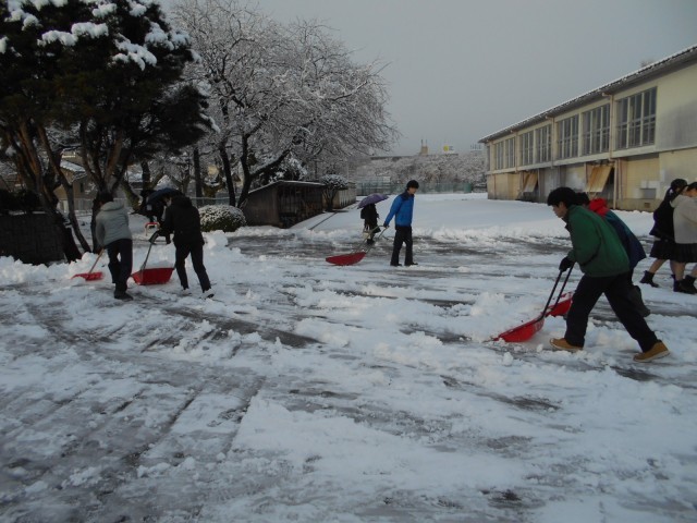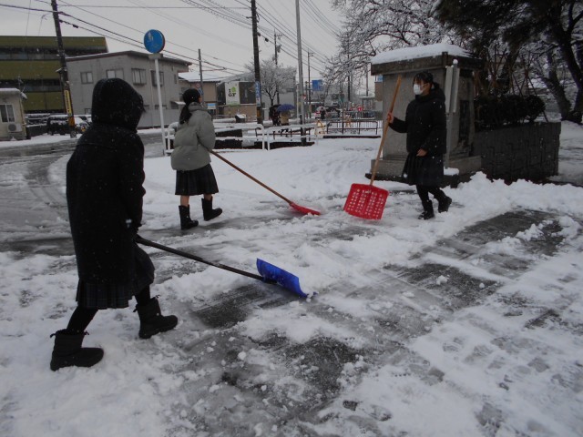 3学期初日は雪となりました。当番の3年2組とボランティア参加の生徒で生徒玄関前をしっかりと除雪してくれました。どうもありがとう。