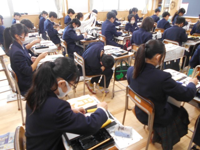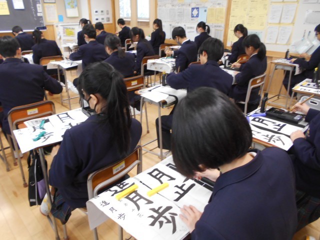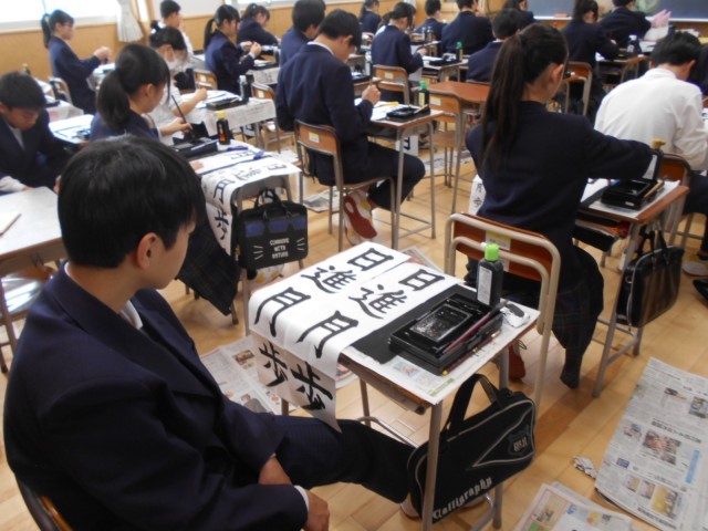 練習の成果を出そうと皆、集中して書いていました。2組では、出来上がった書を見比べ、どちらを提出するか迷っている様子の生徒も見られました。