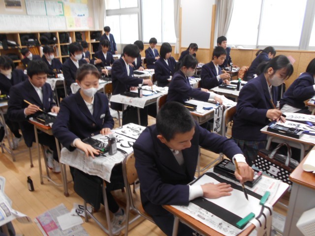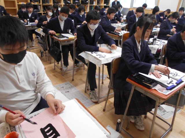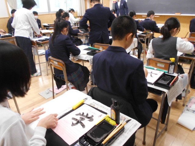 書き初め大会に合わせて、自分の今年の目標を漢字1字で表し、毛筆で書きました。新年を迎え、「学」、「進」など、やる気に満ちた漢字が多かったです。