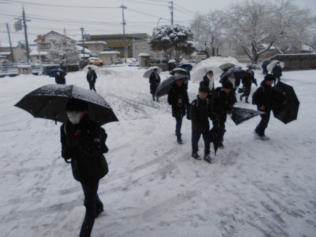 今朝は今冬最強の寒波により、かなりの積雪が予想され、生徒の登校が心配されました。しかし、積雪20センチ程度で済み、さらに富山市が依頼した業者の除雪のおかげで、生徒玄関前の雪はしっかりと取り除かれていました。