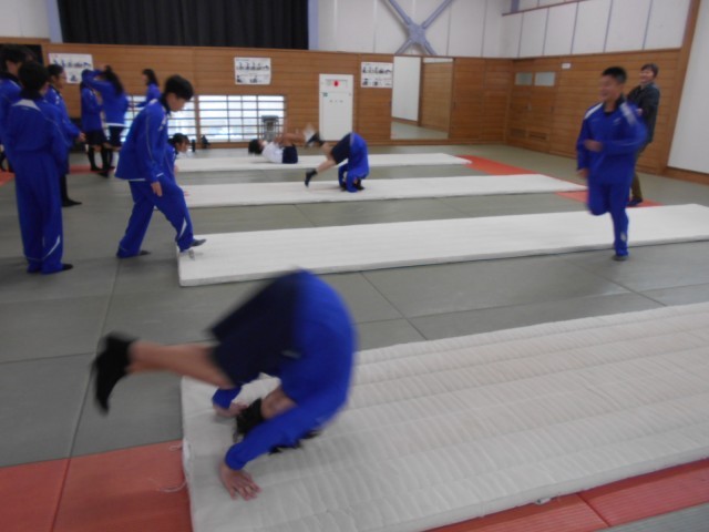 3組保健体育はマット運動が始まりました。久しぶりなので、まずは基本の前転から動きを確認しています。