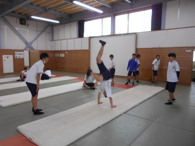 3組保健体育はマット運動。倒立前転を極めようと何度もチャレンジしていました。